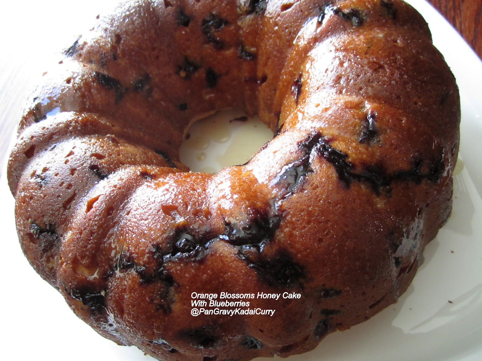This cake is really one of the best tasting cakes I have ever baked. What makes this cake special is the "Orange Blossoms" honey. That divine honey and the succulent blueberries are a truly irresistible combo and I have to thank Zoe Francois of Zoe Bakes for sharing this wonderful recipe at her space. Once I came across this cake recipe, I have been on the hunt for this honey. When I got hold if it, I couldn't wait to give the winning recipe a try! And I didn't have to change a thing about the recipe except for the spice mix-I used all-spice instead of mace powder.This cake is a guaranteed crowd-pleaser! No ifs or buts about it!